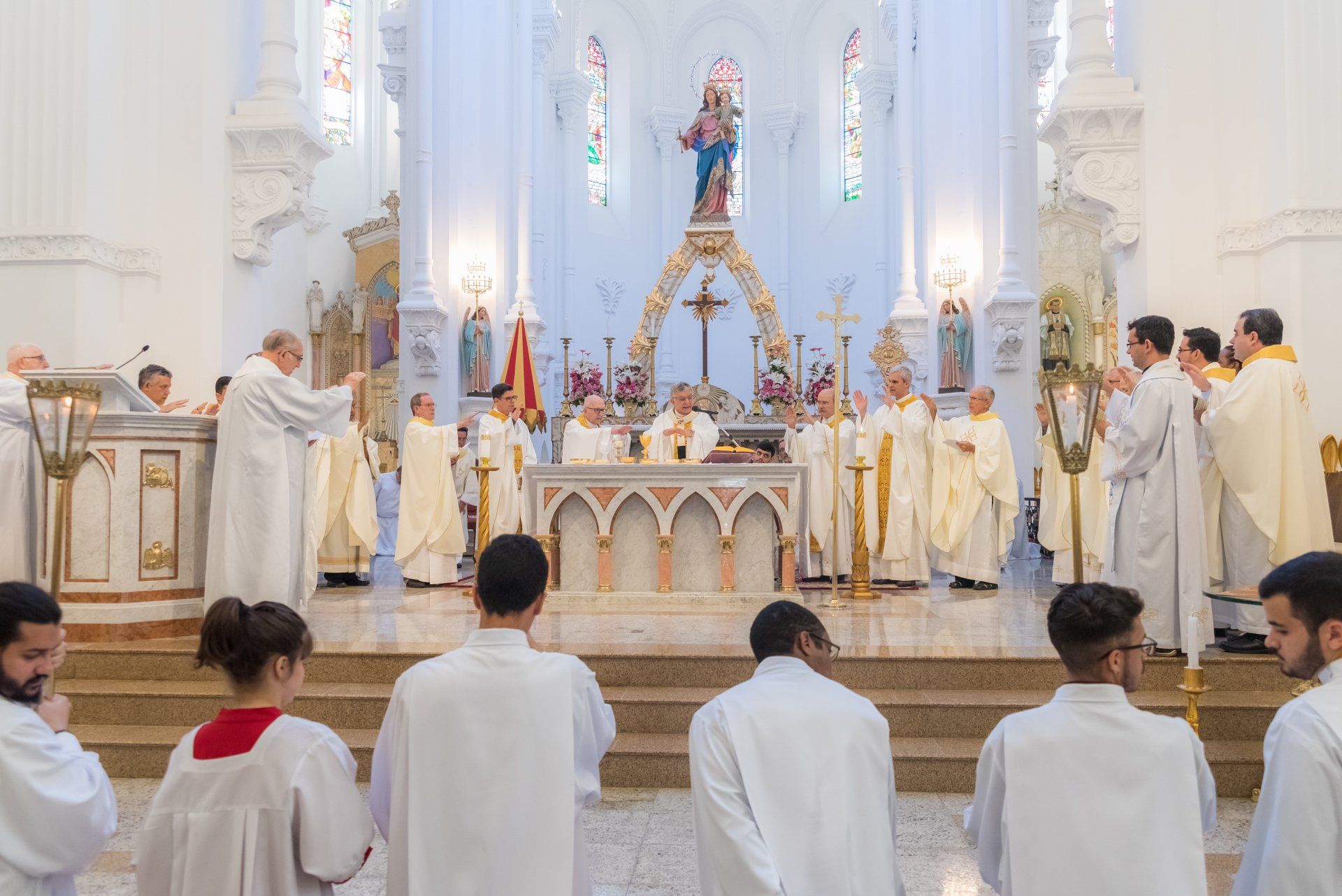 O dia 8 de dezembro de 2018 entrou para a história deste templo-Basílica Menor de Nossa Senhora Auxiliadora como a ocasião em que se realizaram os festejos solenes pelo primeiro centenário de inauguração do edifício sagrado, bem como sua abertura para o culto divino. Data que, diga-se de passagem, não poderia ser mais oportuna: embora o centenário se complete, de fato, no dia 24 de dezembro, o dia 8 carrega um significado especial. Ele marca o início da obra salesiana, em 1841, com o encontro entre Dom Bosco e o adolescente Bartolomeu Garelli, na sacristia da Igreja São Francisco de Assis, em Turim. No calendário litúrgico, é a solenidade da Imaculada Conceição de Nossa Senhora: a celebração das maravilhas de Deus em Maria Santíssima, sobretudo sua concepção sem pecado original, em previsão dos méritos de Cristo. Maria Imaculada, Dom Bosco e a Basílica de Niterói têm tudo a ver!